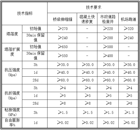 表1-高強(qiáng)快速修補(bǔ)料技術(shù)要求